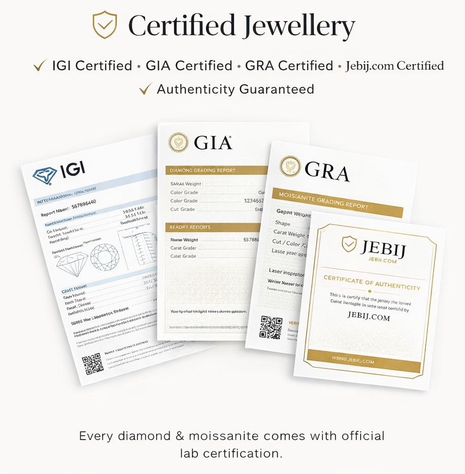 Every diamond and moissanite is carefully tested and certified by reputed laboratories such as IGI, GIA, and GRA, along with our own quality verification process. Each certified stone comes with a grading report and unique identification for complete transparency.