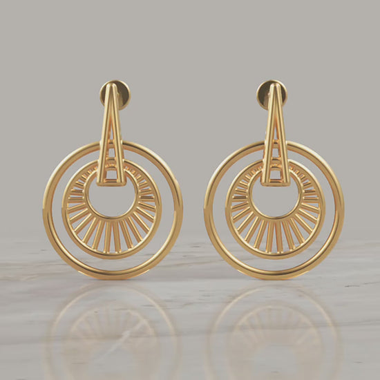 Gold Double Circle Drop Earrings with Sunburst Design 16mm Dangle Earrings