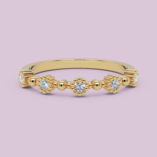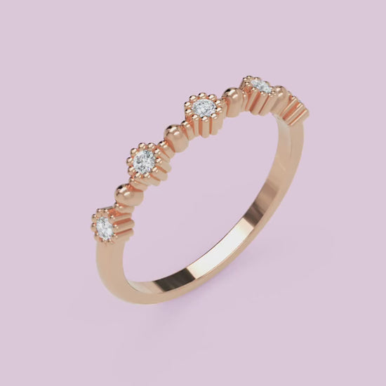 The Diamond Cluster Stackable White Gold Band Ring, which uses material, provides a classic design that suits all types of events. The rose gold diamond ring, the white gold diamond ring, and the yellow gold diamond ring all present elegant and fashionable options. The gold diamond ring features detailed designs and top-notch craftsmanship, which guarantee its status as a beloved item for many years.