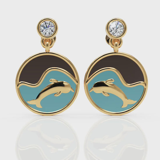 Gold Dolphin Enamel Drop Earrings with Crystal Stud Blue Wave Design Dangle Earrings