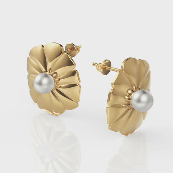 Gold Flower Stud Earrings with Pearl Center 13mm Round Design