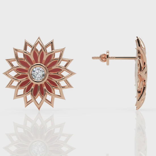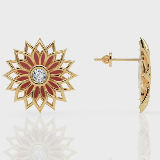 Red Enamel Sunflower Diamond Stud Earrings in White Gold