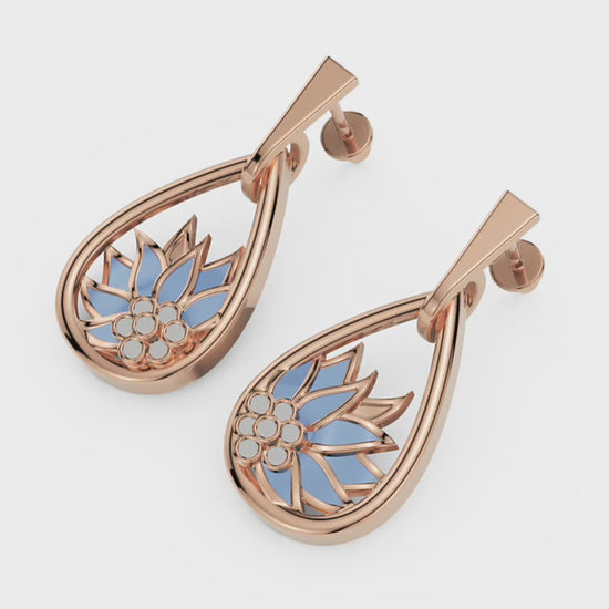 Rose Gold Blue Enamel Lotus Flower Teardrop Earrings