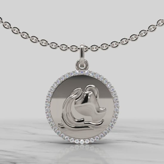 Sterling Silver Aquarius Zodiac Pendant with Diamond Halo Border
